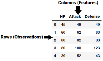 Maşın öyrənməsi alqoritmləri əsasən iki ölçülü verilənlərlə işləyir. Hər bir obyekt (object/observation) atributlardan (attributes/features) təşkil olunmuş vektordur. Bütün obyektlər isə birlikdə iki ölçülü matriks əmələ gətirir. Aşağıdakı şəkildə 5 obyekt və 3 atributdan (HP, Attack, Defense) ibarət nümunə verilmişdir. Məsələn, 0-cı obyekt (HP=45, Attack=49, Defense=49) vektorunu özündə saxlayır.
